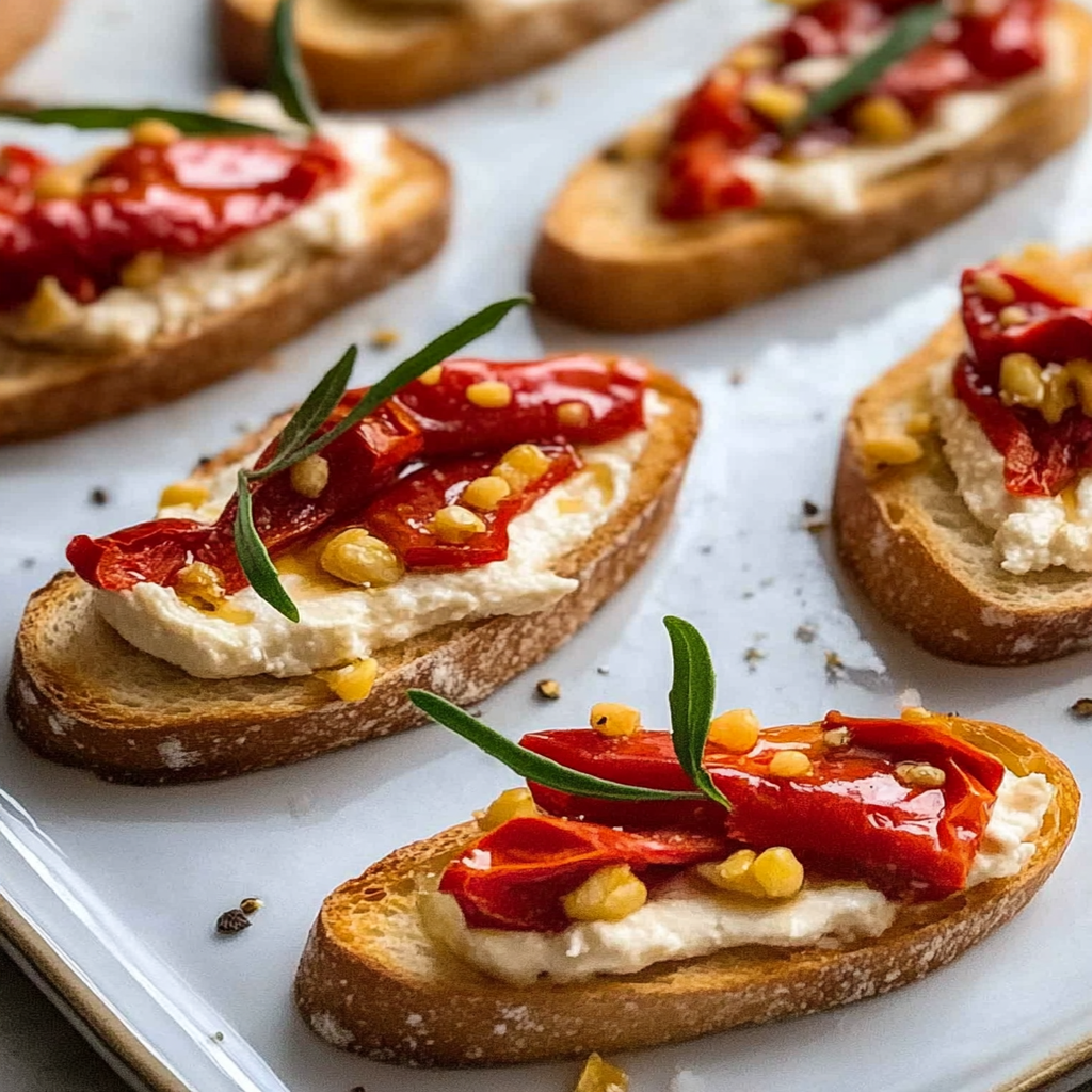 Start by preheating your oven to a high temperature. Slice the baguette into thin pieces and arrange them on a baking sheet. Brush each slice lightly with olive oil and toast them until golden brown. While the bread is toasting, blend roasted red peppers with hummus until smooth. Once the bread is ready, spread the hummus mixture generously on each slice. Garnish with chopped herbs for added freshness and serve immediately for the best taste.