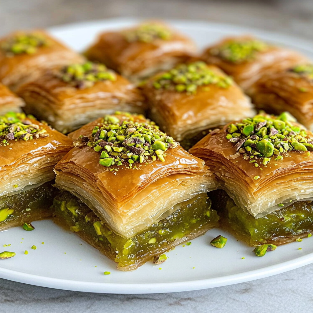 Baklava with Pistachios is a heavenly Middle Eastern dessert that combines layers of flaky phyllo pastry with rich, finely chopped pistachios and a sweet honey syrup. Each bite delivers a delightful crunch followed by a chewy center, making it perfect for celebrations or as a special treat at home. With its stunning golden layers and irresistible flavor, this baklava is sure to impress friends and family alike.