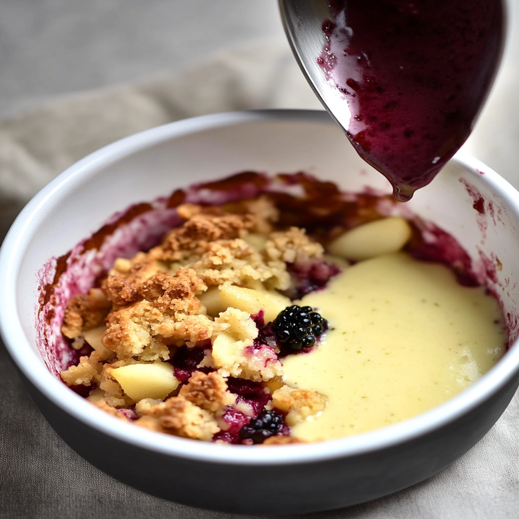 To serve, scoop out generous portions of warm Pear & Blackberry Crumble into bowls and drizzle with that dreamy bay leaf custard for an elegant finish. Enjoy every blissful bite!